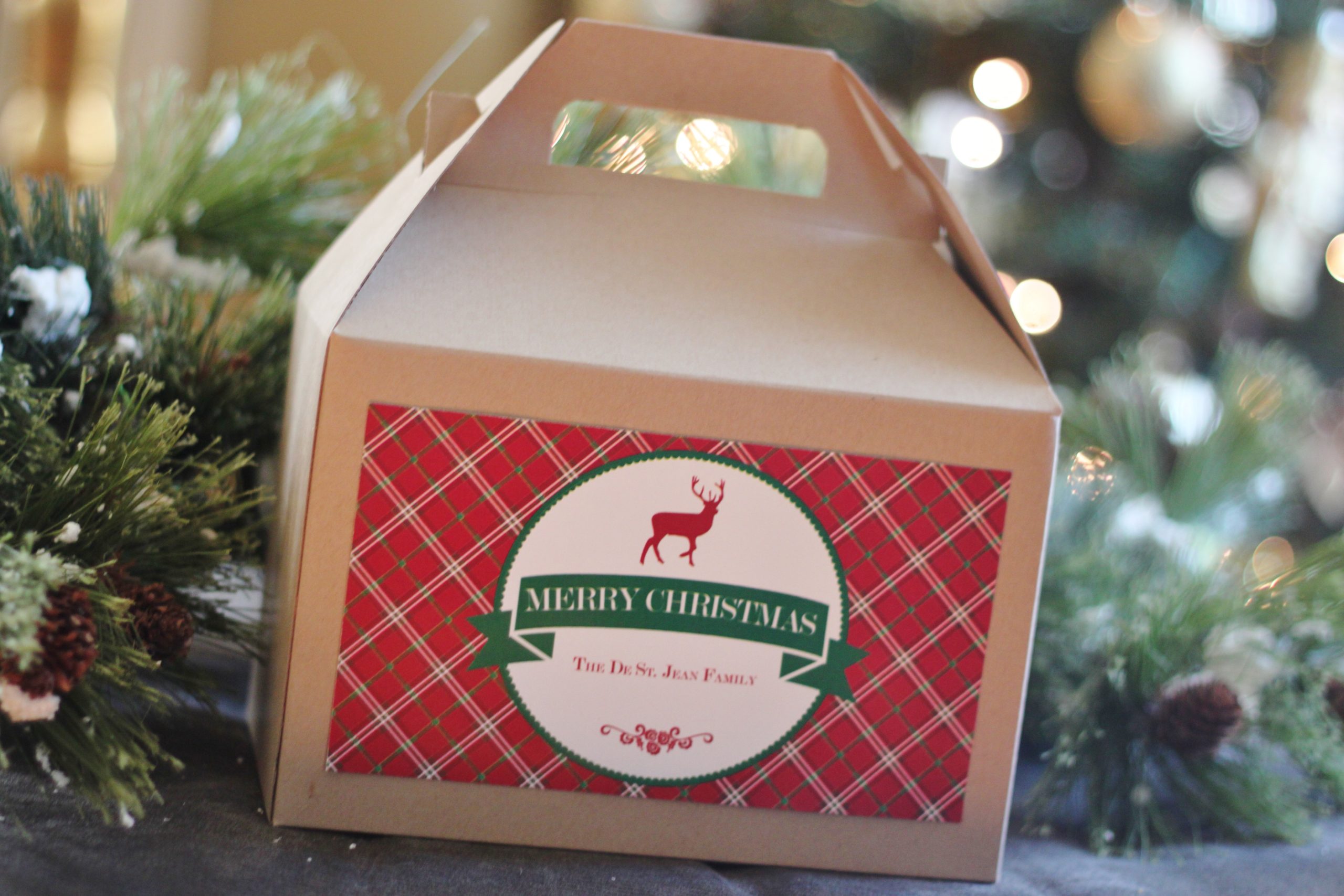 Set of 15 Red Kraft Gable Boxes 8 x 4 7/8 x 5 1/4 with Classic Christmas Plaid labels. I can personalize the text to say whatever you would like.